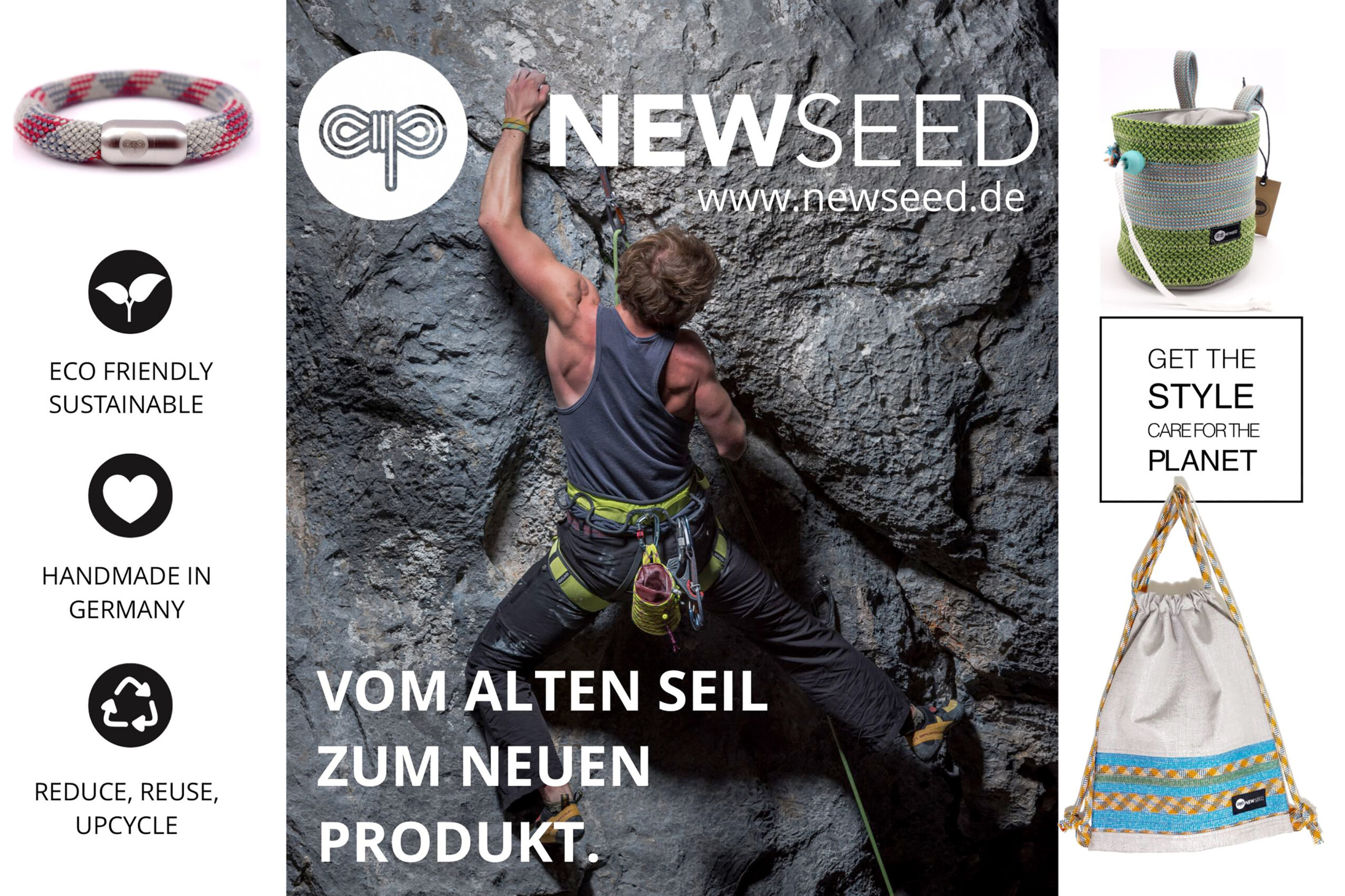 Seit der Gründung des Rosenheimer Unternehmens NEWSEED hat sich einiges getan: Viele Kletterhallen und private Kletterer sind zu Seilrettern geworden. Insgesamt wurden schon über 10000kg ausgesonderter Kletterseile, unzählige Quadratmeter Stoff-Verschnittreste und hunderte alter Klettergurte eingesammelt und zu neuen stylischen Produkten recycelt.