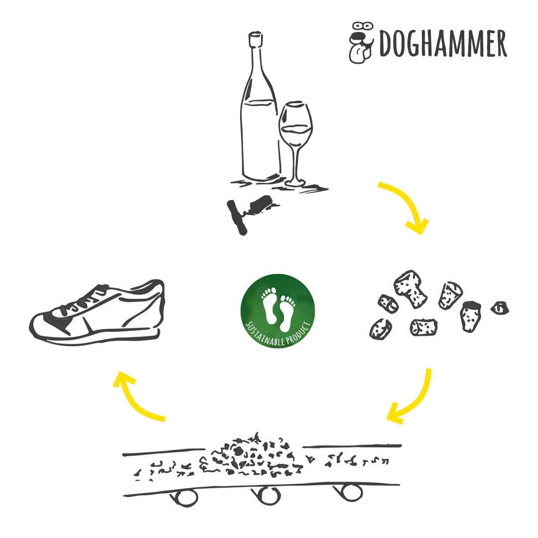 Nachdem du deine Korken bei einem unserer Händler eingeworfen hast, macht sich die volle Cork Collect Box zurück auf den Weg zu uns ins Lager der Cartias Wendelstein Werkstätten. Sobald der Laster mit einer neuen Schuhlieferung aus Portugal bei uns angekommen ist, geben wir ihm die gesammelten Korken wieder direkt mit auf den Weg. So gelangen unsere Korken ohne zusätzlichen Logistikprozess zu unserem Korklieferanten Amorim in Portugal. Hier werden die Korken mit anderen Korkresten zu Korkgranulat geschreddert. Aus dem Korkgranulat können anschließend neue Sohlen- oder Obermaterial für deinen Doghammer Schuh hergestellt werden. Das Korkgranulat wird aber nicht nur ausschließlich zu Materialien für unsere Schuhe verarbeitet, daraus entstehen auch Böden, Pinnwände, Yogablöcke und vieles mehr.